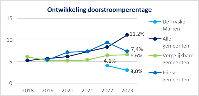 De doorstroom van collega’s binnen de organisatie is laag, zo’n 3%. Dit percentage verhogen vraagt aandacht en inspanningen van HR. In combinatie met voorgaande trend, hogere uitstroom na een kort(er) dienstverband en lage doorstroom binnen onze organisatie betekent dit een grote uitdaging voor de organisatie.